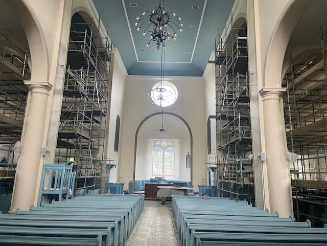 Now that the high work in the nave is complete, scaffolding has been transferred to the side aisles.