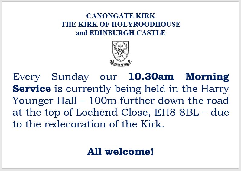 The Kirk will be closed from January to end March 2026 for redecoration (don’t worry – we won’t be changing the blue pews!). Church services will continue as normal but will move to the Harry Younger Hall for the duration of the redecoration work. We are having a number of events to raise money for this expensive but necessary project. If you would like to donate to this essential cause please click on the blue Donation button on the home page or contact the Kirk office.